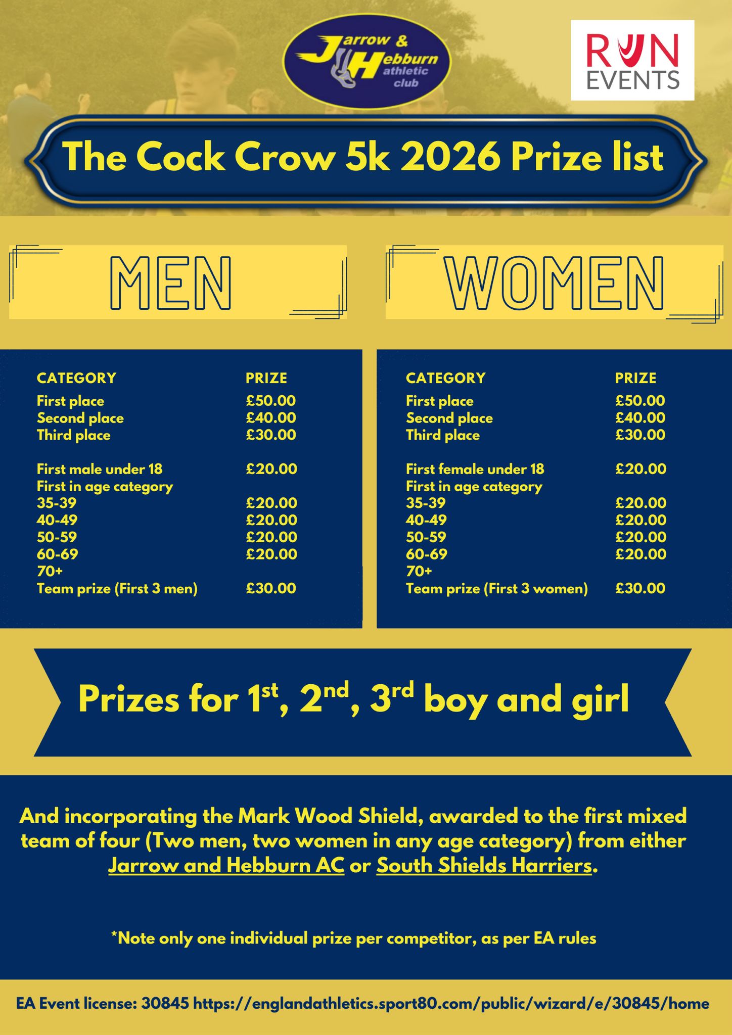 There are prizes for first three male and female finishers in the 5k, plus veteran age categories and team prizes. The race also incorporates a competition to claim the Mark Wood Shield, which is awarded to the first mixed team of four (two men, two women, in any age category) from either Jarrow and Hebburn AC or South Shields Harriers.