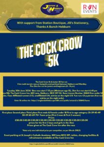 The Cock Crow 5k and Junior 2k Fun Run will take place on Tuesday 30th June.